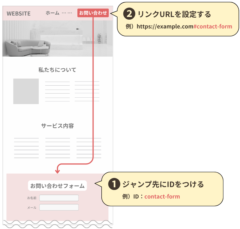 → ボタンやテキストリンクのURL欄に「https://example.com/about#contact-form」を入力