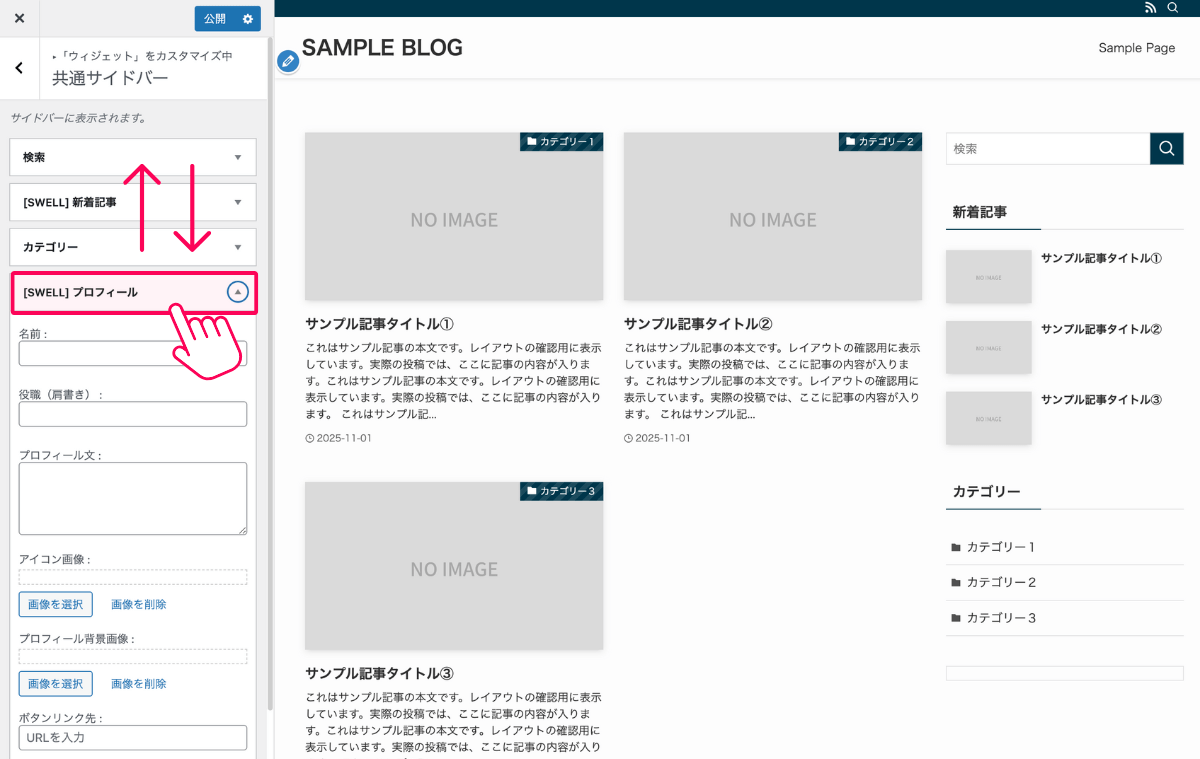 追加されたプロフィールウィジェットは、ドラッグ&ドロップで上下に移動できます。